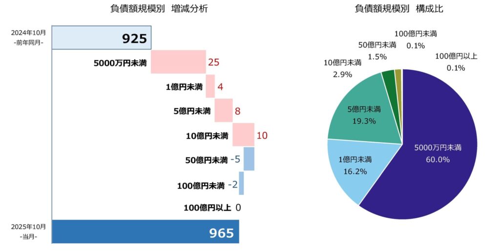 負債額では、5000万円未満が579件で全体の60.0%を占め、2カ月連続で前年を上回った。「5000万円以上1億円未満」は156件、「1億円以上5億円未満」は186件、「5億円以上10億円未満」は28件、「10億円以上50億円未満」は14件、「50億円以上100億円未満」は1件、「100億円以上」は1件だった。