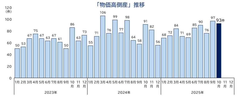 物価高倒産は93件と前年同月比2.2%増で、3カ月連続で前年を上回っている。業種別では小売25件、建設19件、製造17件、卸売・運輸通信が各12件。1~10月累計は805件で前年同期比1.3%増となった。