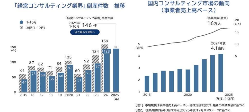 このほかAIが広がるなかで増えているのが経営コンサルティング業者の倒産だ。倒産件数が146件となり、集計を開始した2000年以降で最多だった2024年(159件)を上回るペースで推移し、年間で過去最多の更新が確実とみられるという。特に、資本金「1000万円未満」の割合が8割超を占めるなど小規模な事業者で淘汰が続きそうだという。