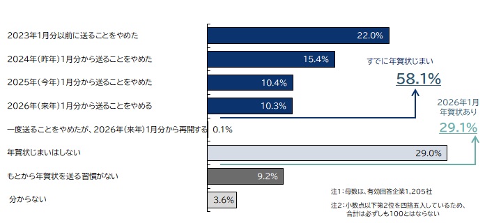 帝国データバンクが実施した「年賀状じまい」に関する企業アンケートによると、すでに年賀状の送付を取りやめた企業は58.1%と、全体の半数を超えた。さらに、2026年分から送付をやめる予定の企業も1割を超え、2026年の年賀状を送る企業は29.1%で3割を下回る見通しだ。