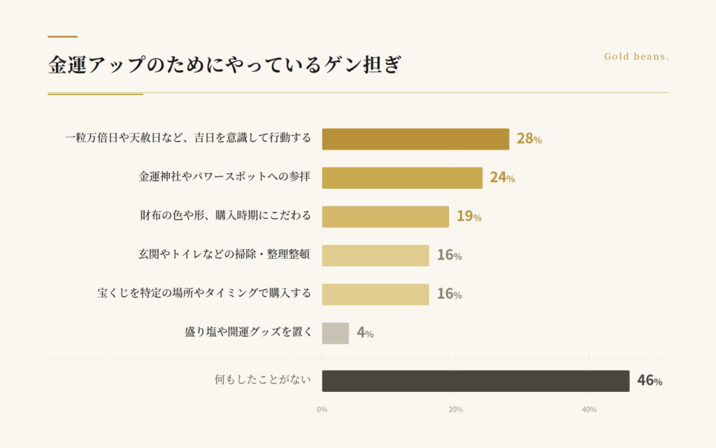前述の調査では、「一粒万倍日など吉日を意識する」(28%)、「金運神社やパワースポット参拝」(24%)、「財布の色や購入時期にこだわる」(19%)がトップ3に挙がった。