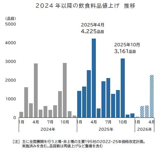 2026年春にかけては大規模な値上げラッシュの発生は限定的とされる。しかし、1000品目前後の価格引き上げは引き続き常態化すると予想されている。