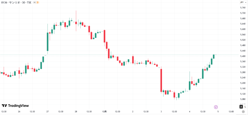 サンリオのポジションとしては、4日の終値(5412円)以上で買い。ただこの場合は、ロスカットは少し深くなって4日の安値(5142円)より下のあたりに設定。