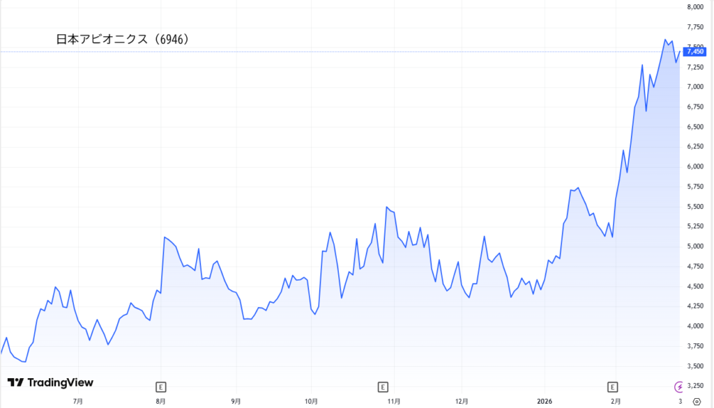 もう一つが、高市政権で注目の「防衛テーマ」の銘柄も軒並み上がっているが、その中でも注目しているのが「日本アビオニクス」(6946)だ。これもチャートを見て投資する人だったら買えない銘柄だろう。