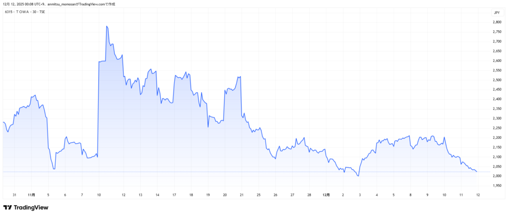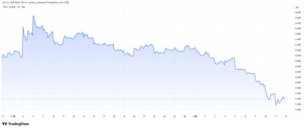 こちらも月足で確認すると2025年の4月、9月の安値を結んだサポートラインの延長線上にいまの株価があるので反発を期待したいところ。