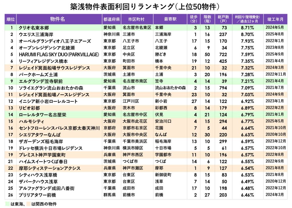 不動産情報会社のマーキュリー(東京都新宿区)は、独自に収集する不動産ビッグデータをもとに築後10年以内のマンション表面利回りランキングを公表した。この調査によると、都心部の利回り低下が進む一方で、郊外物件が相対的に高利回りを維持していることが明確に示された。