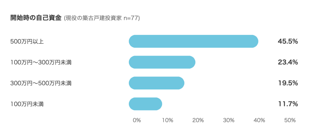 築古戸建は、取得価格が低く、自己資金を抑えやすい。フリマアプリ「ポルティ空き家バンク」を運営するポルティ調査によれば、築古戸建投資家の約30%が自己資金300万円未満で投資を始めている。