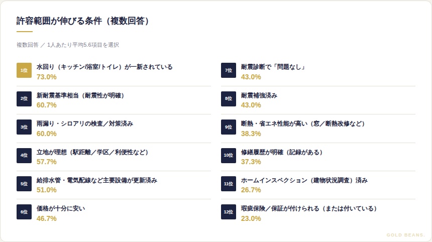 実際、「水回りの一新」73.0%、「耐震性の明確化」60.7%、「設備の更新」51.0%という数字からは、単に安いだけでなく、物件の実態を見極めた「納得感」こそが購入判断の核心になっているということだろう。